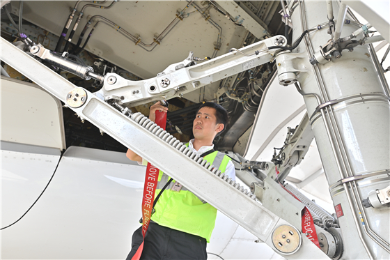 吳俊斌正在檢查一架客機(jī)的散熱器艙