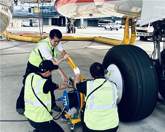 東航機(jī)務(wù)正在為一架剛落地的客機(jī)機(jī)輪通風(fēng)散熱