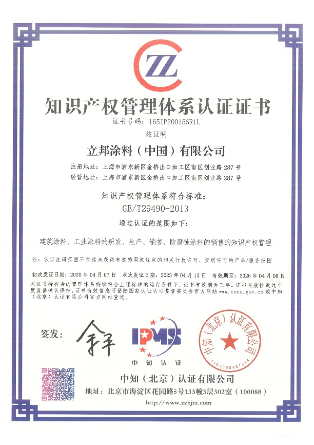 近年來,國(guó)家不斷推進(jìn)知識(shí)產(chǎn)權(quán)強(qiáng)國(guó)建設(shè),提高中國(guó)知識(shí)產(chǎn)權(quán)戰(zhàn)略運(yùn)用水平,促進(jìn)創(chuàng)新型國(guó)家建設(shè),“企業(yè)知識(shí)產(chǎn)權(quán)管理規(guī)范”對(duì)于企業(yè)核心競(jìng)爭(zhēng)力的提升和可持續(xù)發(fā)展有著不可替代的作用。繼2020年獲得初認(rèn)證,三年間立邦憑借科學(xué)化、標(biāo)準(zhǔn)化的知識(shí)產(chǎn)權(quán)管理體系取得了一系列創(chuàng)新成果。新的三年即將開啟,經(jīng)中知(北京)認(rèn)證有限公司[2]對(duì)立邦研發(fā)管理部等各技術(shù)部門的項(xiàng)目可行性分析報(bào)告、立項(xiàng)計(jì)劃、專利檢索報(bào)告等內(nèi)容進(jìn)行嚴(yán)格審核,立邦規(guī)范嚴(yán)謹(jǐn)?shù)闹R(shí)產(chǎn)權(quán)管理工作再次得到了高度認(rèn)可——以此次審核的輕質(zhì)高強(qiáng)抹灰石膏項(xiàng)目為例,該產(chǎn)品采用了石膏緩沖緩凝劑新技術(shù),突破了石膏凝結(jié)時(shí)間穩(wěn)定性的難點(diǎn),而立邦將知識(shí)產(chǎn)權(quán)管理工作悉心落實(shí)至產(chǎn)品開發(fā)前、中、后期,確保創(chuàng)新成果得到切實(shí)保護(hù)。謹(jǐn)此,立邦順利通過認(rèn)證取得《知識(shí)產(chǎn)權(quán)管理體系認(rèn)證證書》。