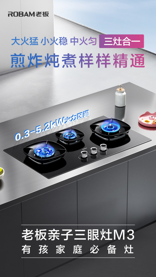有娃家庭人口多烹飪?nèi)蝿?wù)重,孩子吃的小分量食物烹飪難度大,且多代同堂對(duì)烹飪技法要求高。老板親子三眼灶M3的發(fā)布,讓眾多難題迎刃而解,烹飪變得趣味無(wú)窮,廚房生活更輕松。