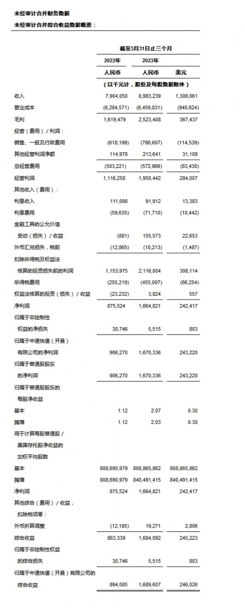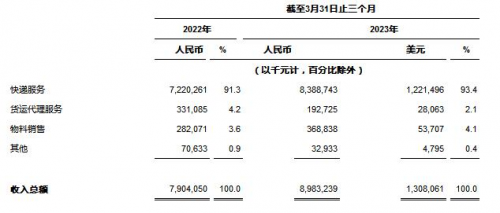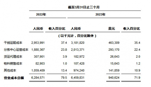 ?收入總額 為人民幣8,983.2百萬元(1,308.1百萬美元),較2022年同期的人民幣7,904.1百萬元增長13.7%。核心快遞服務(wù)收入較2022年同期增長16.1%,該增長是由于包裹量增長20.5%及單票價格下降3.7%的綜合影響所致。貨運(yùn)代理服務(wù)收入較2022年同期減少41.8%,該減少主要是由于全球經(jīng)濟(jì)疲弱導(dǎo)致跨境電商需求和定價下降所致。物料銷售收入主要由打印電子面單所需的熱敏紙銷售收入組成,同比增長30.8%,該等增長與包裹量增長趨勢吻合。其他收入主要由金融貸款業(yè)務(wù)組成。
