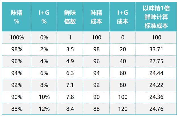 I+G與味精搭配的鮮味呈味倍數(shù)成本對(duì)照表