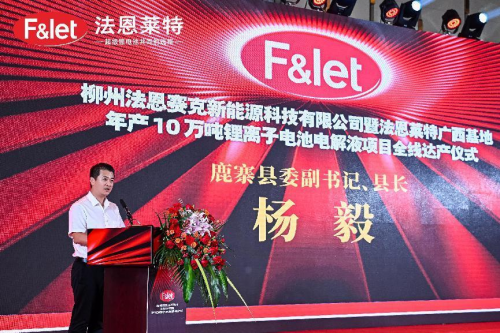8月5日,柳州法恩賽克新能源科技有限公司暨法恩萊特廣西基地年產(chǎn)10萬(wàn)噸鋰離子電池電解液項(xiàng)目全線達(dá)產(chǎn)儀式在廣西柳州盛大舉行。柳州市人民政府副市長(zhǎng)湯振國(guó),鹿寨縣人民政府縣長(zhǎng)楊毅,法恩萊特公司董事長(zhǎng)石俊峰,總經(jīng)理邵俊華等出席儀式,共同見(jiàn)證這一重要時(shí)刻。