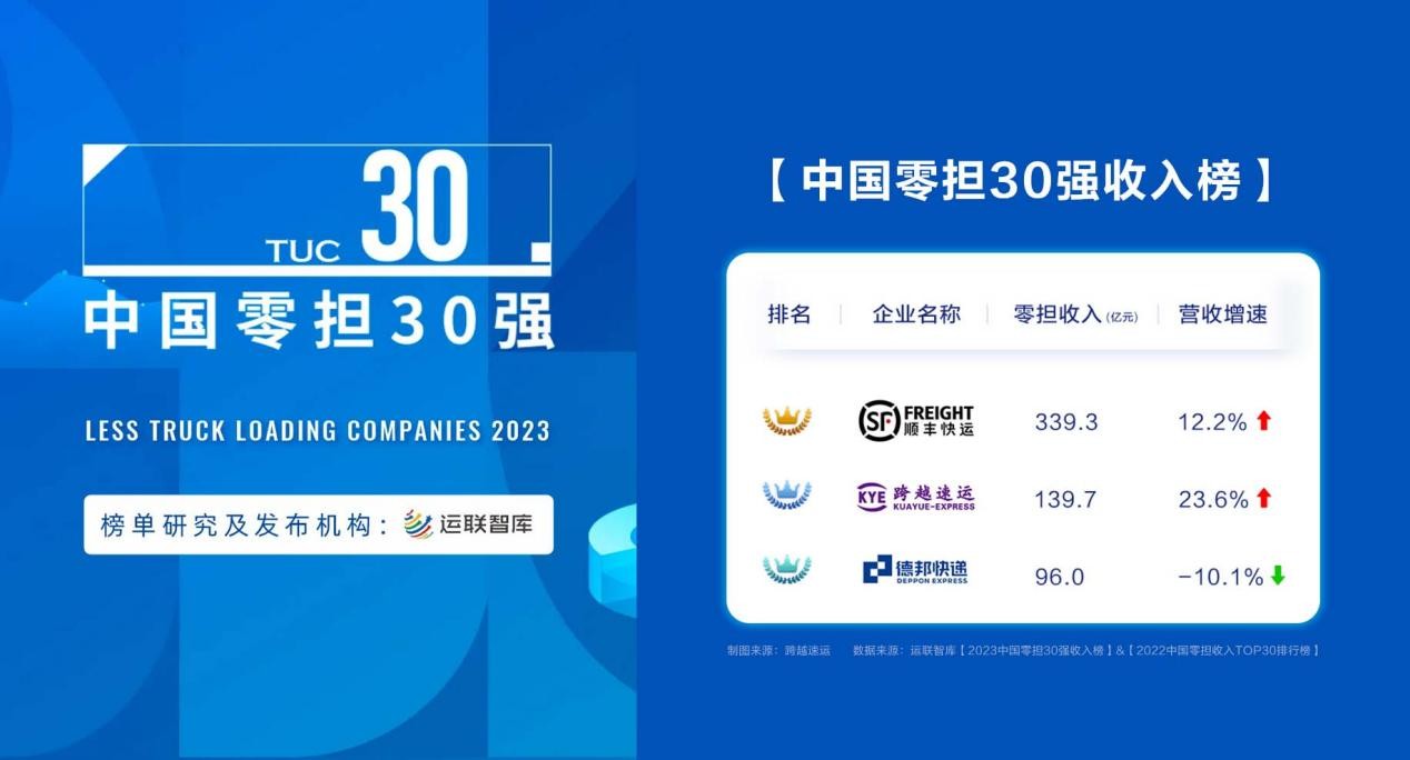 但,過去的16年時(shí)間里,就在大家認(rèn)為快遞領(lǐng)域的競爭進(jìn)入白熱化階段的時(shí)候,跨越卻加速崛起“后來居上”。8月9日,運(yùn)聯(lián)智庫頒布2023中國零擔(dān)排行榜,跨越以139.7億總營收蟬聯(lián)榜單第二名(第一是順豐,第三是德邦),營收增速逆勢提升到23.6%,領(lǐng)跑榜單三甲企業(yè)(順豐12.2%,德邦-10.1%)。