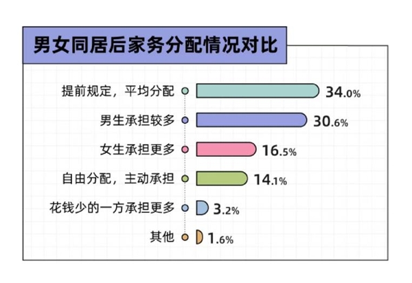 令人意外的是,《報(bào)告》顯示,“男生承擔(dān)更多家務(wù)”的比例為30.6%,高于女生(16.5%),完全顛覆了刻板認(rèn)知。此前的一項(xiàng)調(diào)查也顯示,同居后,男生們的“居家能力”大幅提升,提升幅度甚至超過女生,不過在結(jié)婚后又會(huì)有所下降。