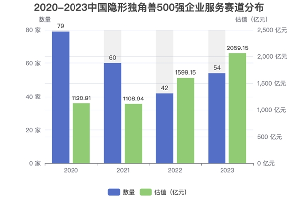 報告顯示,2023中國隱形獨角獸500強(qiáng)企業(yè)服務(wù)賽道獨角獸企業(yè)有54家,估值合計為2059.15億元(如上圖)。根據(jù)BIHU創(chuàng)業(yè)伯樂獨角獸企業(yè)數(shù)據(jù)庫(EMUDB),2021-2023中國隱形獨角獸500強(qiáng)企業(yè)服務(wù)賽道隱形獨角獸企業(yè)同比分別減少19家、減少18家、增加12家;企業(yè)服務(wù)賽道隱形獨角獸企業(yè)估值合計同比分別降低1.07%、增長44.21%、增長28.77%。2023年與2022年相比,企業(yè)服務(wù)賽道隱形獨角獸企業(yè)從42家上漲到54家,增加了12家,漲幅為28.57%,呈現(xiàn)出上升趨勢;估值合計從1599.15億元上漲到2059.15億元,增長了460億元,漲幅為28.77%,呈現(xiàn)出上升趨勢。