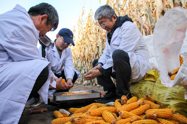 中國農(nóng)業(yè)科學(xué)院作物栽培與生理創(chuàng)新團(tuán)隊首席專家李少昆研究員(右一)在通遼市開魯縣一處千畝片示范田開展工作。記者 連振 攝