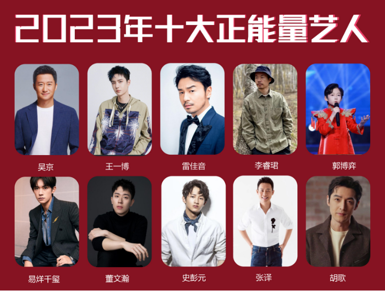 7月31日,由網(wǎng)友評選的2023年十大正能量藝人排行榜揭曉,吳京、王一博、雷佳音、李?,B、郭博弈、易烊千璽、董文瀚、史彭元、張譯、胡歌等10人最終入選。