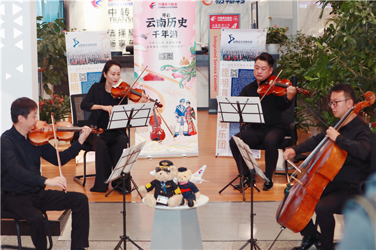 值得一提的是,中國唯一一支以人民音樂家“聶耳”命名的交響樂團——昆明聶耳交響樂團,在主題航班首航儀式活動現(xiàn)場,用專業(yè)、優(yōu)雅的演奏,帶領(lǐng)旅客走進云南,靈動的音符、悅耳的曲調(diào)贏得了旅客的稱贊與掌聲。