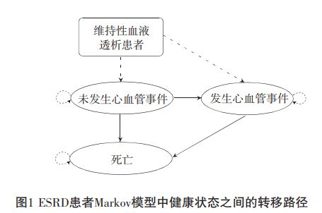 研究采用Markov模型法,將模型結構分為未發(fā)生心血管事件(NCVD)、發(fā)生心血管事件(CVD)、死亡(death)三個獨立狀態(tài),模擬接受常規(guī)血液凈化以及聯(lián)合HA樹脂血液灌流的ESRD患者疾病進程,計算接受不同治療方案患者的疾病成本與質量調整壽命年(QALY)。模型循環(huán)周期為26周,研究時限為終生,評估不同治療方案患者的疾病成本與質量調整壽命年。