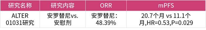 ALTER 01031的Ⅱ期隨機(jī)對(duì)照研究的結(jié)果表明,對(duì)比安慰劑,安羅替尼組的客觀緩解率(ORR)達(dá)到48.39%,可以顯著延長(zhǎng)中位無(wú)進(jìn)展生存期(mPFS)達(dá)9.6個(gè)月(20.7個(gè)月 vs. 11.1個(gè)月)[8],為晚期MTC患者帶來(lái)顯著的PFS及ORR獲益,并且安全性良好。安羅替尼甲狀腺髓樣癌適應(yīng)癥的獲批,打破了國(guó)內(nèi)甲狀腺髓樣癌無(wú)靶向藥可用的局面,給患者帶來(lái)新希望。