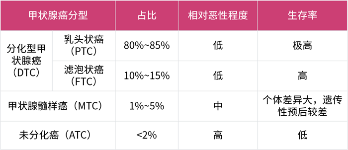 根據(jù)腫瘤起源及分化差異,甲狀腺癌主要分為乳頭狀癌、濾泡狀癌、未分化癌和髓樣癌。其中乳頭狀癌和濾泡狀癌又統(tǒng)稱為分化型甲狀腺癌(DTC),占所有甲狀腺癌的90%以上,而且大部分分化型甲狀腺癌患者可以長(zhǎng)期生存,也就是大家常說(shuō)的“幸福癌”。