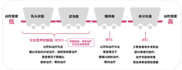 但并非所有類型的甲狀腺癌都這么溫和,不同類型的甲狀腺癌,相較而言惡性程度也是不一樣的[2,7]。
