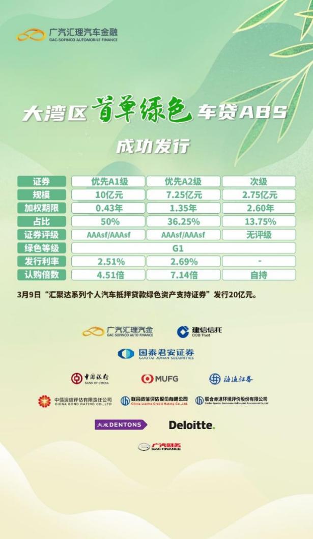 與此同時(shí),廣汽匯理良好的綠色金融資產(chǎn)也獲得了資本市場的認(rèn)可。今年3月9日,廣汽匯理發(fā)行了粵港澳大灣區(qū)首單綠色車貸ABS——匯聚達(dá)2023年第一期個(gè)人汽車抵押貸款綠色資產(chǎn)支持證券。本次入池資產(chǎn)均為廣汽埃安品牌新能源汽車個(gè)人貸款,經(jīng)綠色認(rèn)證機(jī)構(gòu)聯(lián)合赤道評估分析,入池資產(chǎn)對應(yīng)的新能源汽車,預(yù)計(jì)每年可實(shí)現(xiàn)二氧化碳減排6.07萬噸,節(jié)約標(biāo)準(zhǔn)煤2.85萬噸,有效地助力了我國節(jié)能減排事業(yè)開展。