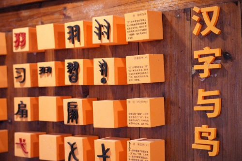 在這個書屋中,項目團(tuán)隊別出心裁地規(guī)劃了一個叫“漢字與鳥”的板塊,包含了從甲骨文到現(xiàn)代所有與鳥相關(guān)的漢字。緊鄰這個板塊的墻上是一整排純手工制作的傳統(tǒng)卷軸,里面寫滿了與鳥相關(guān)的千古名句。位于大廳正中央的是一幅巨型馬影湖手繪地圖,上面標(biāo)注著當(dāng)?shù)刂饕暮蝤B種類,供參觀者學(xué)習(xí)。