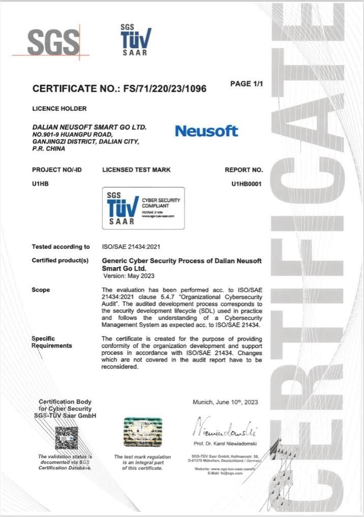 從產(chǎn)品開(kāi)發(fā)到組織管理,東軟將汽車(chē)電子與網(wǎng)絡(luò)安全高度融合,形成一整套汽車(chē)網(wǎng)絡(luò)安全管理流程,覆蓋智能網(wǎng)聯(lián)汽車(chē)安全的整個(gè)生命周期,踐行對(duì)客戶(hù)持續(xù)全面保障網(wǎng)絡(luò)安全服務(wù)的鄭重承諾,也由此順利完成管理體系認(rèn)證的全部?jī)?nèi)容并獲得了認(rèn)證證書(shū),得到了SGS的高度稱(chēng)贊。