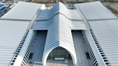 從空中俯瞰,會展中心整體設(shè)計以鳳凰形象為靈感,以“羽飛長空、科創(chuàng)未來”為設(shè)計理念,采用由屋脊向兩側(cè)舒展的“中軸對稱、輕盈飄逸”設(shè)計造型寓意“臨空之翼、展翅騰飛”,表達科技引領(lǐng)經(jīng)濟騰飛,未來發(fā)展青云直上的美好祝愿。