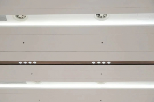 三層交通廳,位于會議中心的兩翼,聯(lián)通展廳、公共通道及休息區(qū)域上層空間為玻璃采光頂,精致的走線輔以200余盞筒燈,創(chuàng)造獨特的建筑感觀。