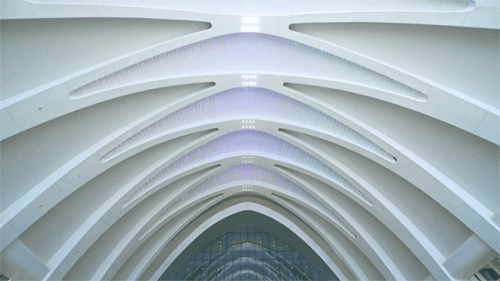 登陸廳聯(lián)通南廣場承載著陸、驗票、安檢、人流集散的作用,滿足各種展覽開幕式、大型活動會議等功能需求。大廳造型猶如精美的機艙,給人安全包容的視覺體驗,亦如展翅高飛的羽翼,歡迎四方來客。
