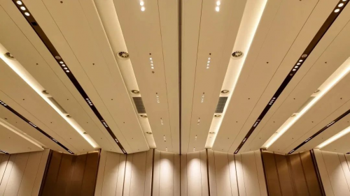 會議門廳,與兩側(cè)VIP前室相連,向北聯(lián)通室外廣場,挑高最高處達24米,采用香檳金色蜂窩鋁板,整體造型呼應(yīng)建筑鳳“翼”舒展的形態(tài),向北廣場方向傾斜5°。