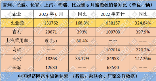 中國(guó)經(jīng)濟(jì)網(wǎng)記者通過(guò)梳理廠家公開的數(shù)據(jù)和乘聯(lián)會(huì)發(fā)布的數(shù)據(jù)發(fā)現(xiàn),6月,比亞迪乘用車、吉利、長(zhǎng)安乘用車、長(zhǎng)城的銷量分別為133762輛、126595輛、118303輛、101186輛,同比分別上漲168.8%%、26%、37.6%、0.52%;上半年累計(jì)銷量分別為641350輛、613842輛、629175輛、518525輛,同比分別上漲314.9%、-3%、-4.61%、-16.12%。?