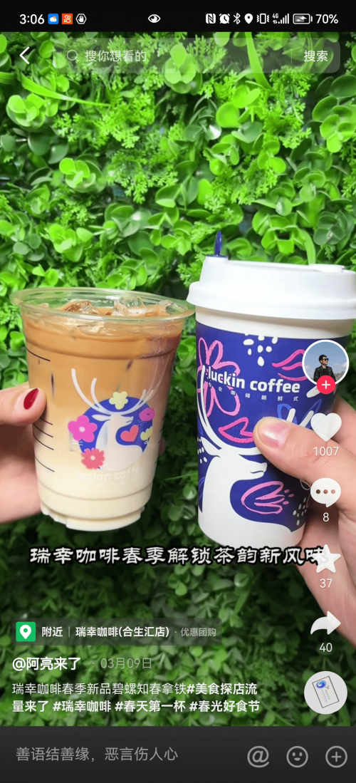 咖啡品類更是春日營銷的主力軍,3 月 6 日,瑞幸官宣新品「碧螺知春拿鐵」,新品與被譽為「鄉(xiāng)村超?!沟年懴扇撕献?。在新品推介過程中,瑞幸不僅將直播間搬到了生茶園,打造沉浸式的直播體驗,讓用戶在觀看直播享受“寵粉式”福利的同時,感受到濃濃的春日氛圍感。不僅如此,瑞幸邀約了一萬名LV3以上的短視頻達人,借助帶貨達人力量為瑞幸茶咖季種草引流,引發(fā)站內(nèi)視頻投稿數(shù)4.7萬條。同期,瑞幸咖啡篩選了33位直播達人,在多城市開展了“瑞幸茶咖季”為主題的系列達人直播,通過直播達人承接品牌官方自播熱度和流量?!复汗夂檬彻?jié)」營銷節(jié)點中,通過短視頻種草、官方直播及達人直播,以一系列別具一格的“茶咖大秀”實現(xiàn)破圈層營銷,迅速完成種草全網(wǎng),最終獲得破億的支付GMV。