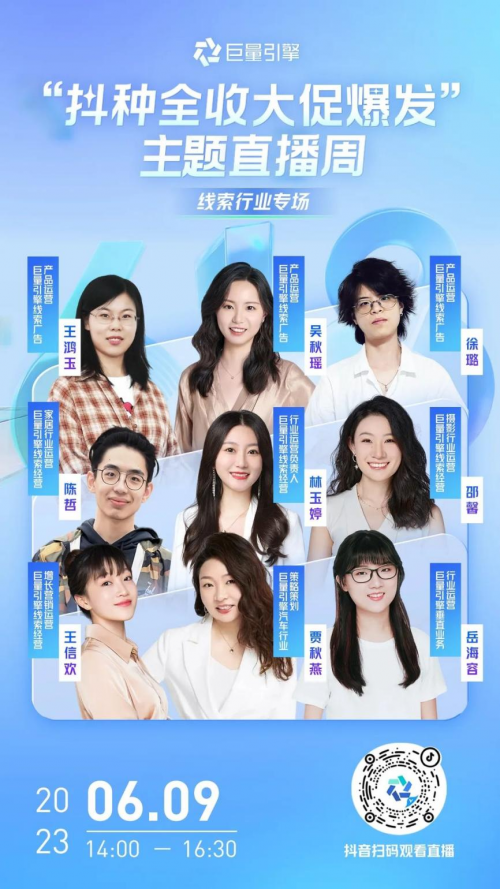 關(guān)注“巨量引擎小助手”抖音號,6月9日14:00,來線索行業(yè)618直播專場,了解更多活動政策及作戰(zhàn)攻略。