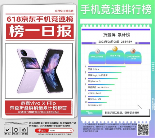 最近京東618火熱進(jìn)行中,囤完日用品,也該將自己卡頓或拍攝性能落后的手機(jī)換新了。除了性能出色的直板智能機(jī),還可以選擇嘗鮮,換新折疊屏手機(jī)試試。不過很多人都表示自己平時(shí)也不關(guān)注手機(jī)圈的事情,配置也就看個(gè)大概,不知道怎么選。沒關(guān)系,京東618推出了手機(jī)競速排行榜,京東APP搜索“競速榜”即可進(jìn)入,不同喜好和預(yù)算都能選到適合的產(chǎn)品,其中就有折疊屏手機(jī)銷量累計(jì)榜。截至6月8日,vivo X Flip、vivo X Fold2、OPPO Find N2 Flip成為折疊屏手機(jī)銷量累計(jì)榜TOP3,下面就帶大家一起看看這些在榜折疊屏手機(jī)。