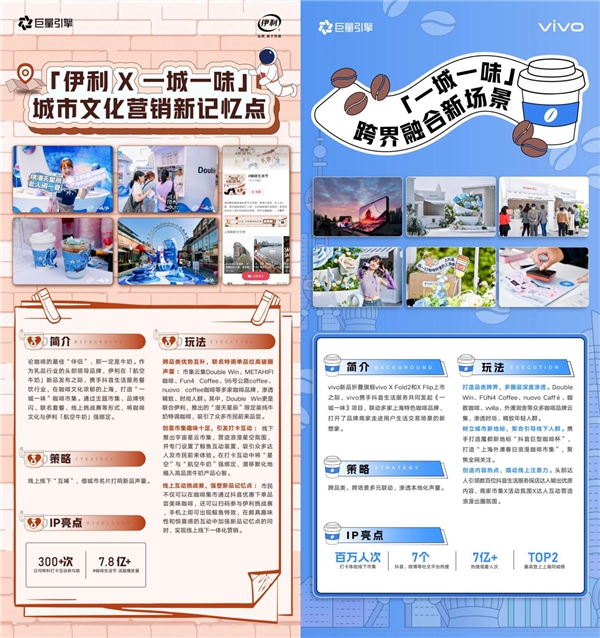 在垂類營銷層面,抖音生活服務打造《一城一味》IP,分別聯(lián)合vivo、伊利開展跨界營銷,借由上海咖啡文化周及“咖啡市”的城市文化名片,通過線上種草、線下聚合客流打卡體驗的方式,將品牌新品融入用戶高頻生活場景,有力強化上海本地消費者對新品的認知。