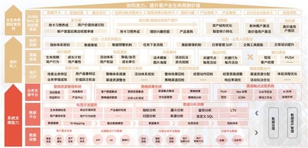 上圖為數(shù)字化經(jīng)營能力全景圖,最上層為全生命周期經(jīng)營規(guī)劃,即 AUM&MAU 雙軌經(jīng)營體系,包括不同階段的主要運(yùn)營目標(biāo),如新手期主要為用卡習(xí)慣養(yǎng)成、用戶價(jià)值快速識別、新戶首面后離店經(jīng)營繼承等。