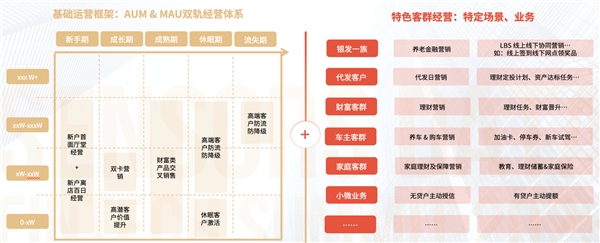 在 MAU + AUM 雙軌客群經(jīng)營模式下,接入特色客群、業(yè)務(wù)條線的經(jīng)營體系,進(jìn)行經(jīng)營策略補(bǔ)碼,完善經(jīng)營策略體系,使得線上經(jīng)營更加立體。MAU + AUM 雙軌客群經(jīng)營模式在基礎(chǔ)運(yùn)營框架體系中增加了“生命周期”的維度,生命周期是培育客戶的過程。金融機(jī)構(gòu)還可以在基礎(chǔ)框架上根據(jù)特定的業(yè)務(wù)場景和主題,制定相應(yīng)的經(jīng)營策略。