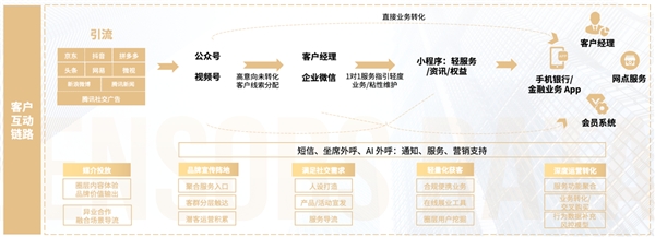 金融企業(yè)在客戶全鏈路互動(dòng)與經(jīng)營上,涉及到的渠道觸點(diǎn)也比較多。通常,在引流階段,客戶通過交易型 App、資訊類 App、種草媒體等進(jìn)行互動(dòng),之后進(jìn)入公眾號、視頻號為主的公私域轉(zhuǎn)換的形態(tài),如果轉(zhuǎn)化周期較長,還會通過客戶經(jīng)理和企業(yè)微信進(jìn)行 1V1 服務(wù)引導(dǎo)和關(guān)系維護(hù),還可以直接導(dǎo)量到小程序或 H5 進(jìn)行輕轉(zhuǎn)化,以及到手機(jī)銀行、金融業(yè)務(wù) App,結(jié)合客戶經(jīng)理、網(wǎng)點(diǎn)服務(wù)和會員系統(tǒng)加強(qiáng)后鏈路深度運(yùn)營。