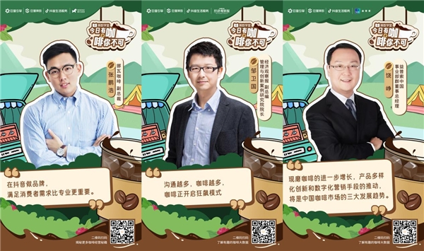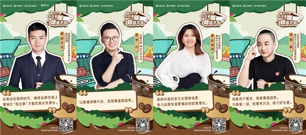 為此《算數學堂》重磅推出《今日有咖·啡你不可》欄目,聚焦咖啡賽道,為品牌商家們指點迷津,并邀請了8位重磅嘉賓,專業(yè)覆蓋咖啡生態(tài)各個環(huán)節(jié),包括消費行業(yè)專家2位、咖啡品牌商家代表2家、品牌代理服務商1家、抖音生活服務專家2位、巨量引擎商業(yè)分析1位,他們將分別從各自的領域出發(fā),分享有關咖啡行業(yè)未來趨勢、品牌經營方法論、抖音平臺數字化營銷秘籍等真知灼見。