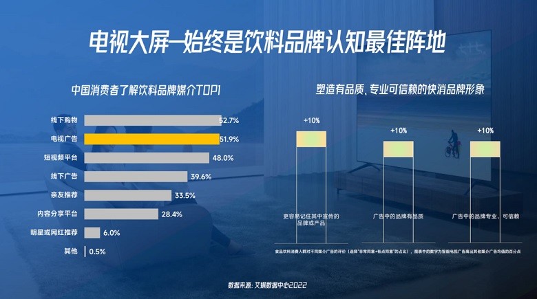 根據(jù)艾媒數(shù)據(jù)中心2022的統(tǒng)計分析,電視廣告是中國消費(fèi)者了解飲料品牌的第一媒介,是建設(shè)飲料品牌認(rèn)知的最佳陣地,有助于塑造高品質(zhì)、可信賴的品牌形象。