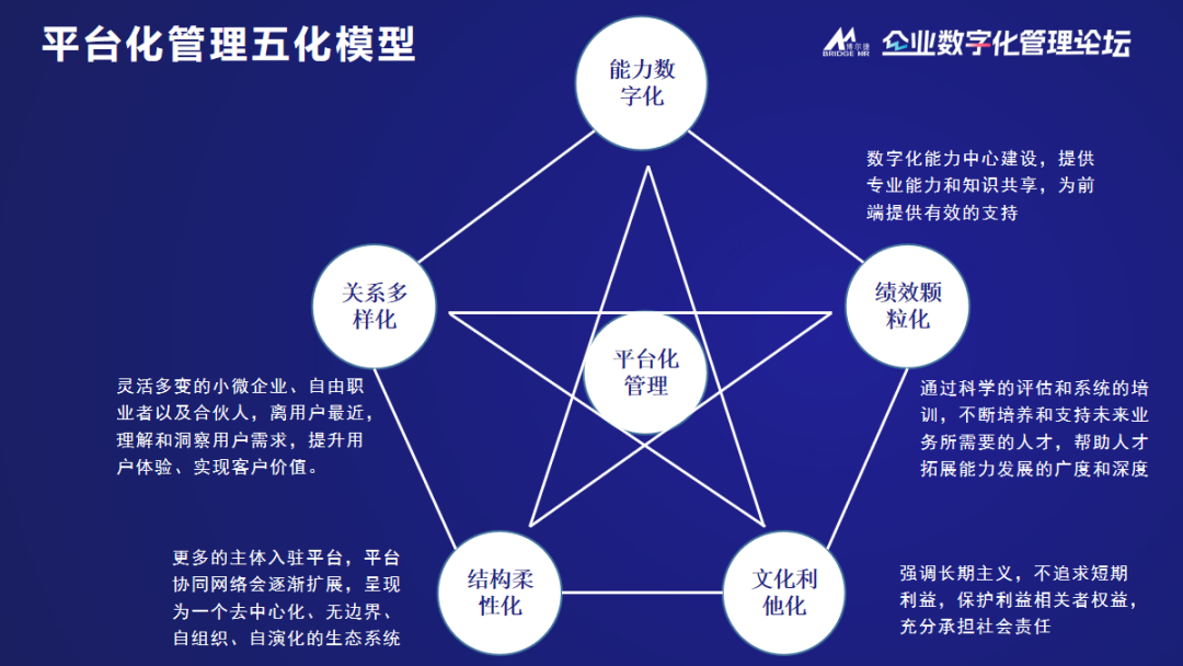 5. 文化利他化:公司文化要強(qiáng)調(diào)堅持長期主義,不能追求短期的利益,以保護(hù)利益相關(guān)者的權(quán)益而充分地承擔(dān)社會責(zé)任。平臺化管理的文化是內(nèi)化于心,尤其是外部合伙人要幫助他。