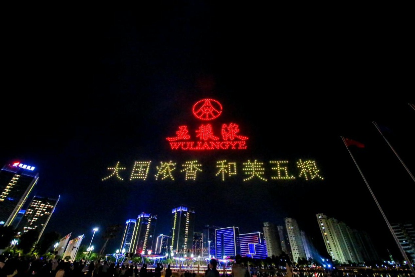 2023世界品牌莫干山大會舉行期間,五糧液品牌LOGO組成的無人機(jī)燈光秀讓與會嘉賓印象深刻