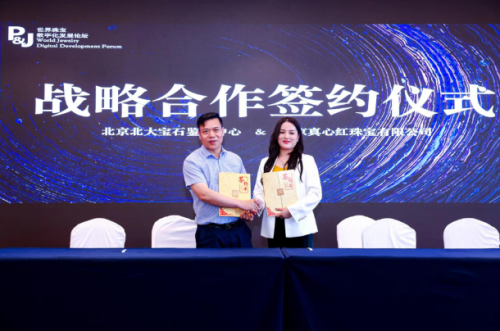 活動現(xiàn)場,北京北大寶石鑒定中心與北京真心紅珠寶有限公司還舉辦了現(xiàn)場簽約儀式,雙方將在珠寶鑒定、數(shù)字化溯源以及從業(yè)人員專業(yè)培訓(xùn)等多個版塊開展豐富的合作。
