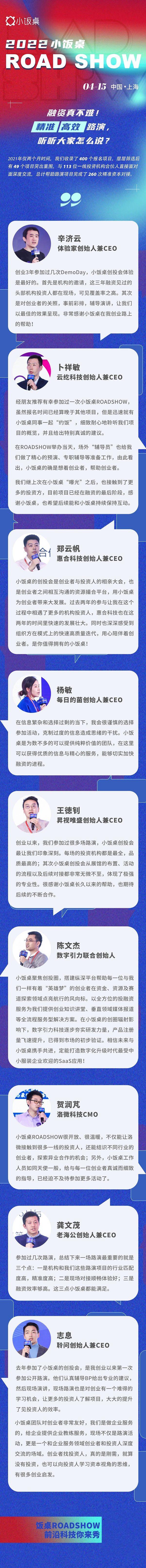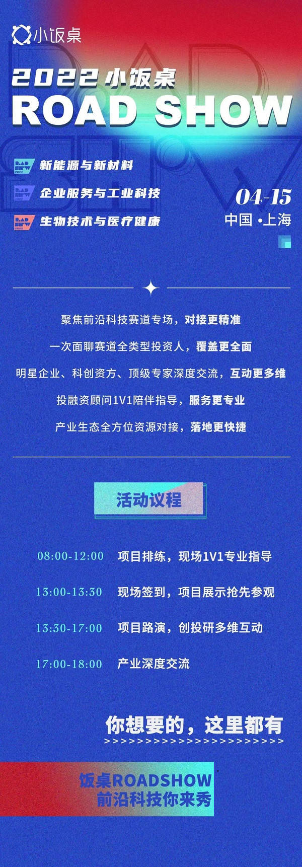 導(dǎo)語:4月15日,2022小飯桌ROASHOW將登陸上海,將開設(shè)“新能源與新材料”、“企業(yè)服務(wù)與工業(yè)科技”、“生物技術(shù)與醫(yī)療健康”賽道專場路演,歡迎各位優(yōu)秀的科技創(chuàng)業(yè)者前來應(yīng)戰(zhàn)!