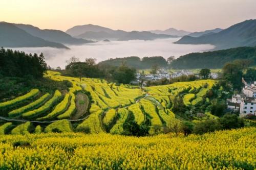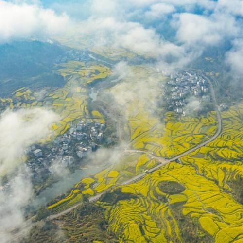 進(jìn)入三月中旬以來(lái),江西婺源的十萬(wàn)多畝油菜花競(jìng)相開(kāi)放,正式進(jìn)入了盛花期。迷人花海遍布每個(gè)村莊,風(fēng)姿灼灼,景色迷人。在“中國(guó)四大花?!敝坏慕瓗X景區(qū),漫山遍野的油菜花隨著梯田彎曲的線條蜿蜒至遠(yuǎn)方,猶如金蛇舞動(dòng),蔚為壯觀。在李坑、思溪延村等景區(qū)油菜花盛開(kāi)于徽派建筑之間,與小橋、流水、人家構(gòu)成了一幅娟秀柔美的江南春景圖,引來(lái)了天南地北的游客賞花潮。