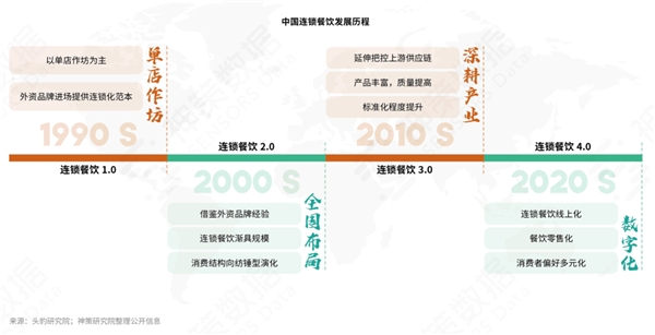 中國連鎖餐飲發(fā)展經(jīng)歷了“單店作坊、全國布局、深耕產(chǎn)業(yè)、數(shù)字化”四個階段,目前已經(jīng)進入 4.0 數(shù)字化階段,呈現(xiàn)線上化、零售化、消費者偏好多元化的趨勢。