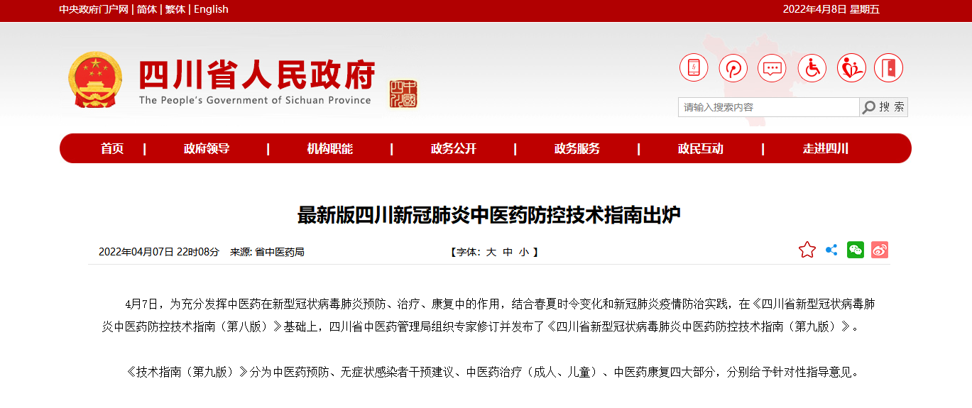 為充分發(fā)揮中醫(yī)藥在新型冠狀病毒肺炎預(yù)防、治療、康復(fù)中的作用,結(jié)合春夏時(shí)令變化和新冠肺炎疫情防治實(shí)踐。4月7日,四川省中醫(yī)藥管理局在《四川省新型冠狀病毒肺炎中醫(yī)藥防控技術(shù)指南(第八版)》基礎(chǔ)上,修訂并發(fā)布《四川省新型冠狀病毒肺炎中醫(yī)藥防控技術(shù)指南(第九版)》。其中,連花清瘟顆粒(膠囊)被推薦用于臨床治療期外感風(fēng)熱證和風(fēng)熱夾濕證的治療。連花清咳片被推薦用于醫(yī)學(xué)觀察期咽干、咽痛、咳嗽,或伴發(fā)熱等癥狀的治療。