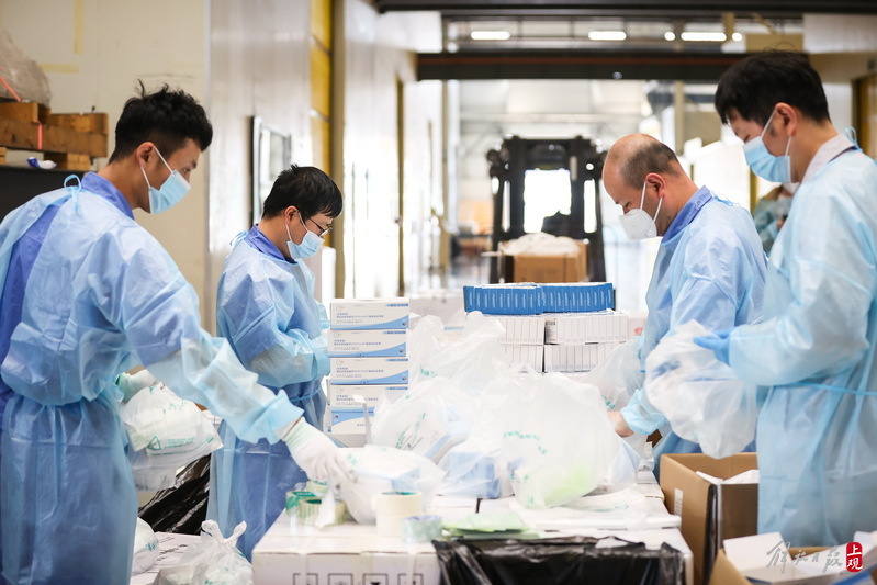 2022年4月11日,上觀新聞記者來到業(yè)績路上的寶山防疫服務(wù)包最大的分裝車間,這里原本是上海漢虹精密機(jī)械有限公司的生產(chǎn)廠房,但該廠百余名志愿者從早上八點(diǎn)就開始分批次投入到了防疫物資的分裝“流水線”作業(yè)中,一張張清單核對,一件件物資分裝,現(xiàn)場熱火朝天。