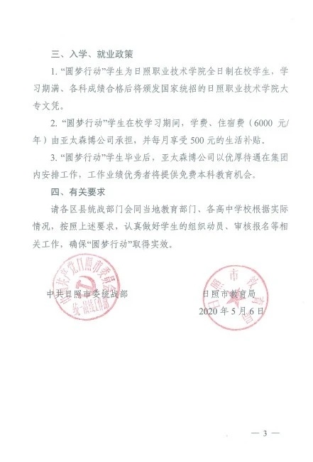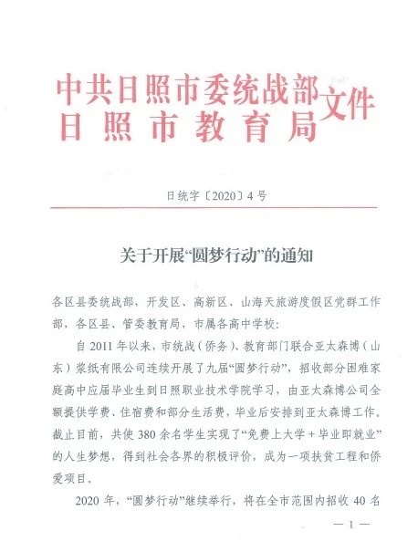 2011年,亞太森博與統(tǒng)戰(zhàn)部門合作開展的“圓夢行動(dòng)”正式啟動(dòng)。亞太森博出資,統(tǒng)戰(zhàn)協(xié)調(diào)教育部門出政策,與大學(xué)合作,為考上大學(xué)的家庭貧困高中生解決學(xué)費(fèi)、生活費(fèi),圓夢大學(xué)。