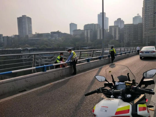 27歲的楊洋是上海英盾保安服務(wù)有限公司駐江北區(qū)公安分局交巡警支隊摩巡中隊(以下簡稱“渝警驍騎”)的一名隊員。2020年4月16日早上08時30分許,在渝澳大橋附近巡邏的楊洋突然接該支隊指揮室指令,稱渝澳大橋中間往渝中區(qū)方向有女子輕生。此時正值上班高峰期,交通堵塞嚴(yán)重。接到指令后的楊洋立馬騎上巡邏摩托車前往事發(fā)地段,在其到達(dá)離事發(fā)現(xiàn)場約10米左右的距離時,看到欲輕生女子已有一只腳跨出橋上欄桿,意欲再翻越欄桿跳下。此時有兩位民警正在耐心勸說,情況十分危急。