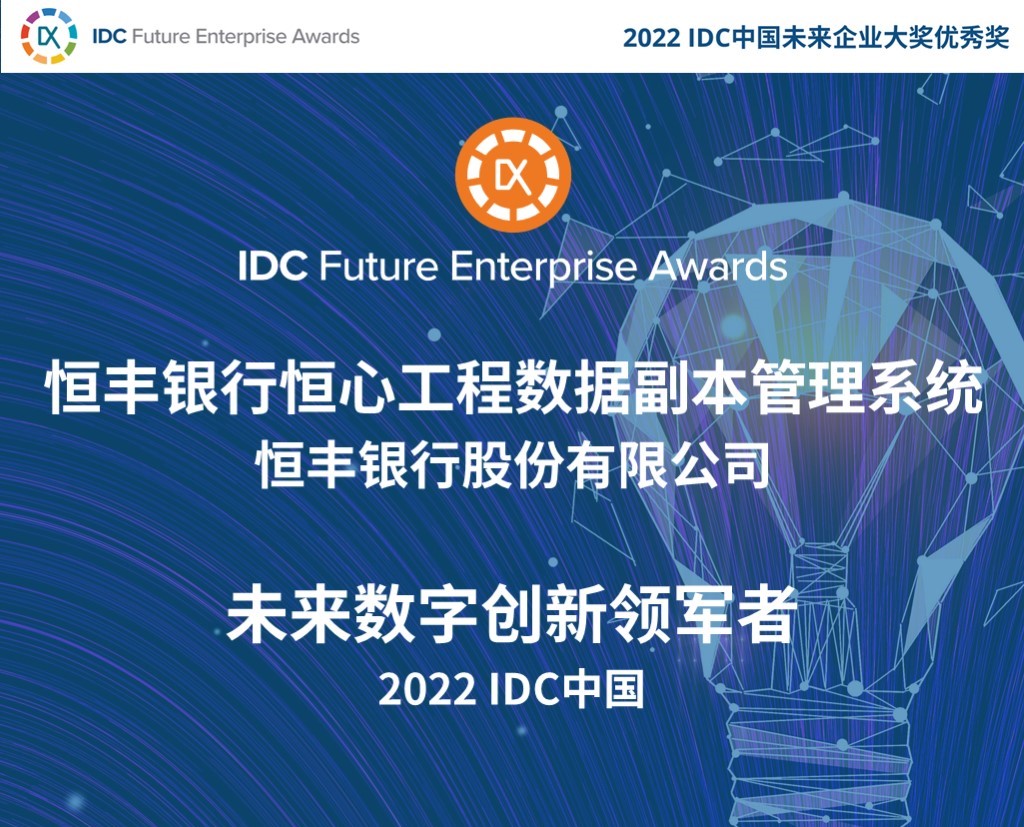 9月1日,IDC中國正式發(fā)布2022IDC中國未來企業(yè)大獎優(yōu)秀案例獲獎名單,恒豐銀行憑借恒心工程數(shù)據(jù)副本管理系統(tǒng)項目獲評“未來數(shù)字創(chuàng)新領軍者”優(yōu)秀獎。