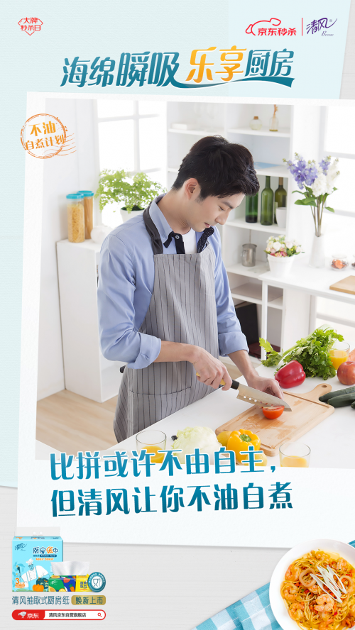 為此,清風(fēng)推出“不油自煮計劃”, 以煥新上市的清風(fēng)海綿吸廚房紙巾為依托,用“一抹即凈”的不油體驗和“一掃就會”的自煮攻略,幫助用戶破除廚房恐懼,給不同身份的用戶輕松自煮不油膩的廚房體驗,讓TA們能不由自主地愛上烹飪,輕松享受做飯帶來的快樂。