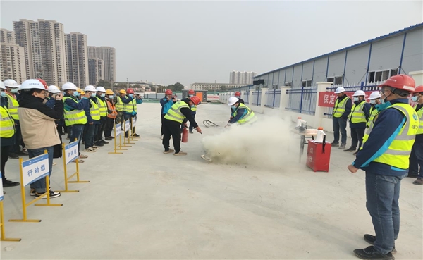 最后,在現(xiàn)場開展模擬火災救援演練,項目管理人員與施工作業(yè)人員進行現(xiàn)場滅火實操演練。