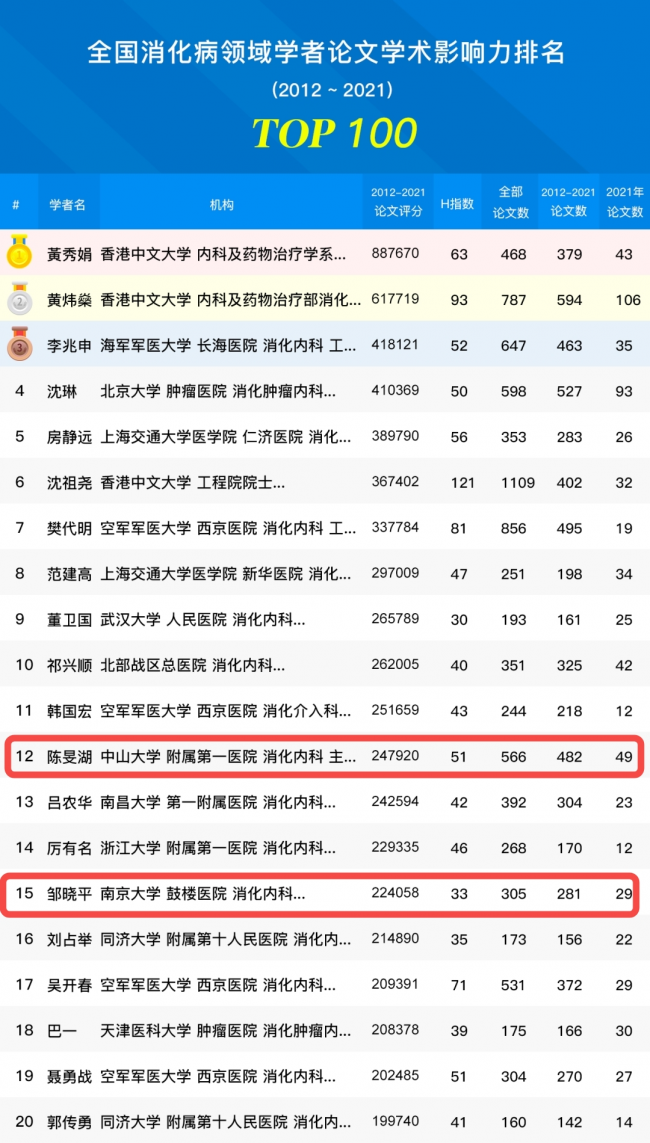 在今年全球?qū)W者庫發(fā)布的《2012-2021年全國消化病領(lǐng)域?qū)W者論文學(xué)術(shù)影響力排名》中,泰康醫(yī)療旗下深圳前海泰康國際醫(yī)院(籌)高級顧問陳旻湖教授與泰康仙林鼓樓醫(yī)院院長鄒曉平教授雙雙入選TOP100。其中,陳旻湖教授以H指數(shù)(在一定期間內(nèi)發(fā)表的論文至少有h篇的被引頻次不低于h次)51、全部論文數(shù)566篇,位列全國總排名第12位;鄒曉平教授則以H指數(shù)33、全部論文數(shù)305篇,位列全國總排名第15位。