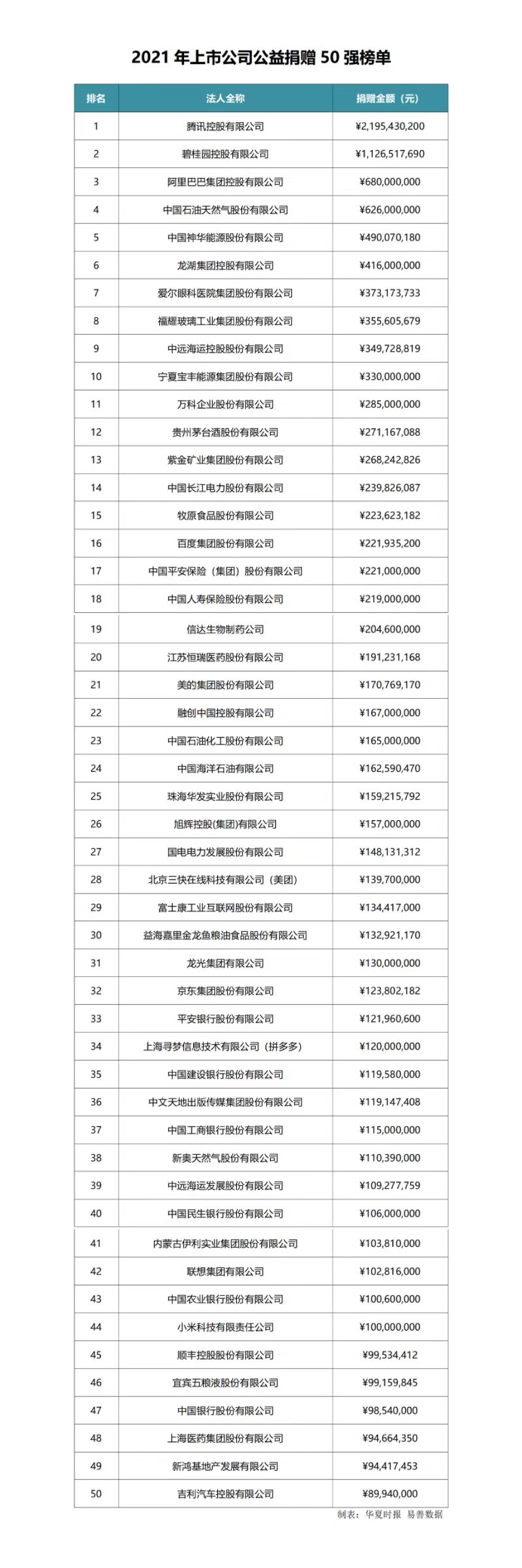 《報(bào)告》公布了2021年上市公司公益捐贈(zèng)50強(qiáng)榜單。
