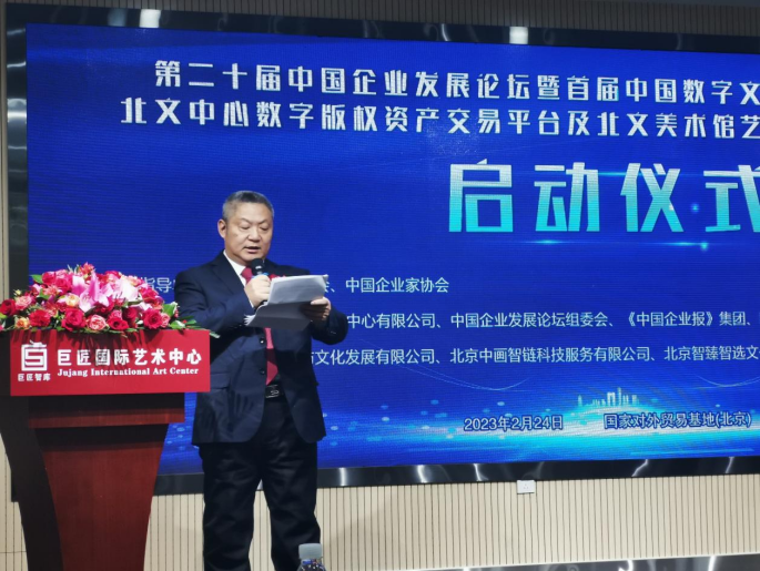 2023年2月24日,第二十屆中國企業(yè)發(fā)展論壇暨首屆中國數(shù)字文化產(chǎn)業(yè)投資高峰論壇啟動儀式在國家對外文化貿(mào)易基地(北京)舉行。與此同時,北文美術(shù)館藝術(shù)品交易服務平臺、北文中心數(shù)字版權(quán)資產(chǎn)發(fā)行平臺啟動儀式也如期舉辦。